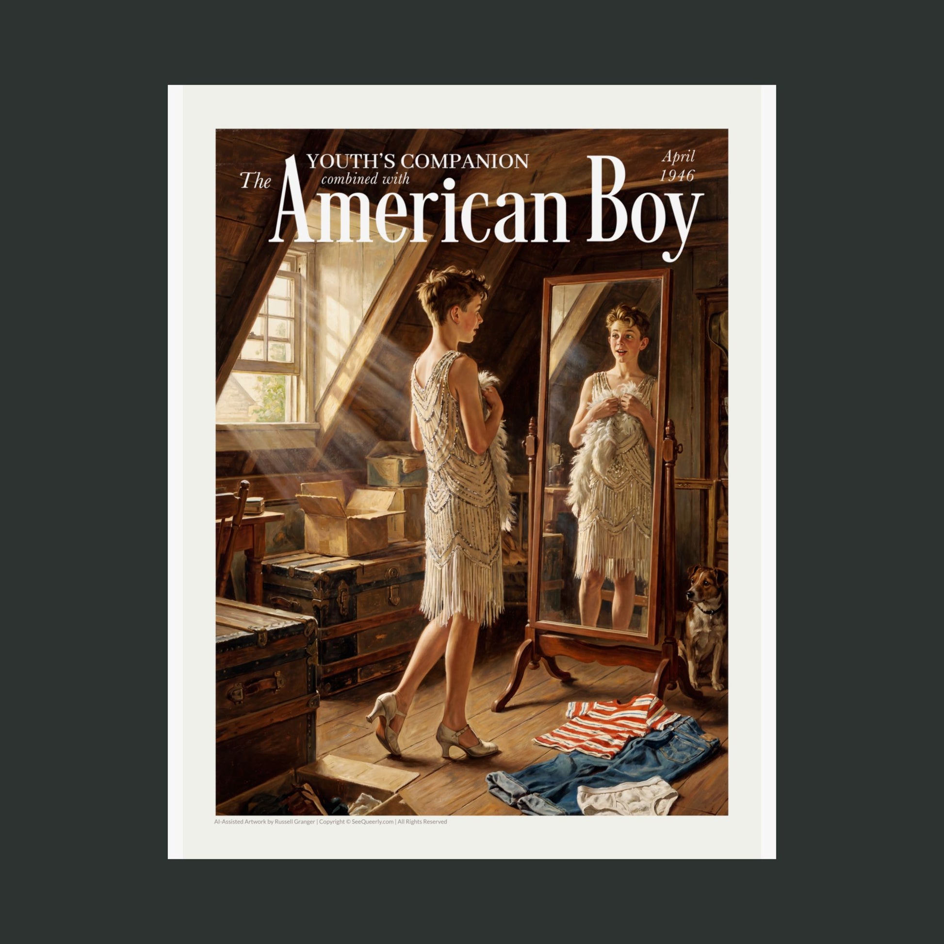 In a sunlit attic—half storage room, half sanctuary—a boy pauses before a mirror in a borrowed dress, studying not a costume but a question. The moment is private, almost archetypal: trunks of old clothes, slanting rafters, a shaft of afternoon light catching the shimmer of fringe. Such experiments are rarely recorded, though they are nearly universal—small rehearsals of self, undertaken in secrecy and wonder.