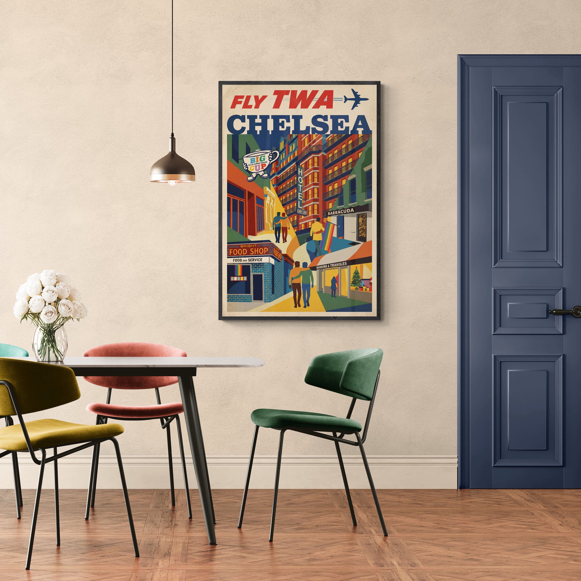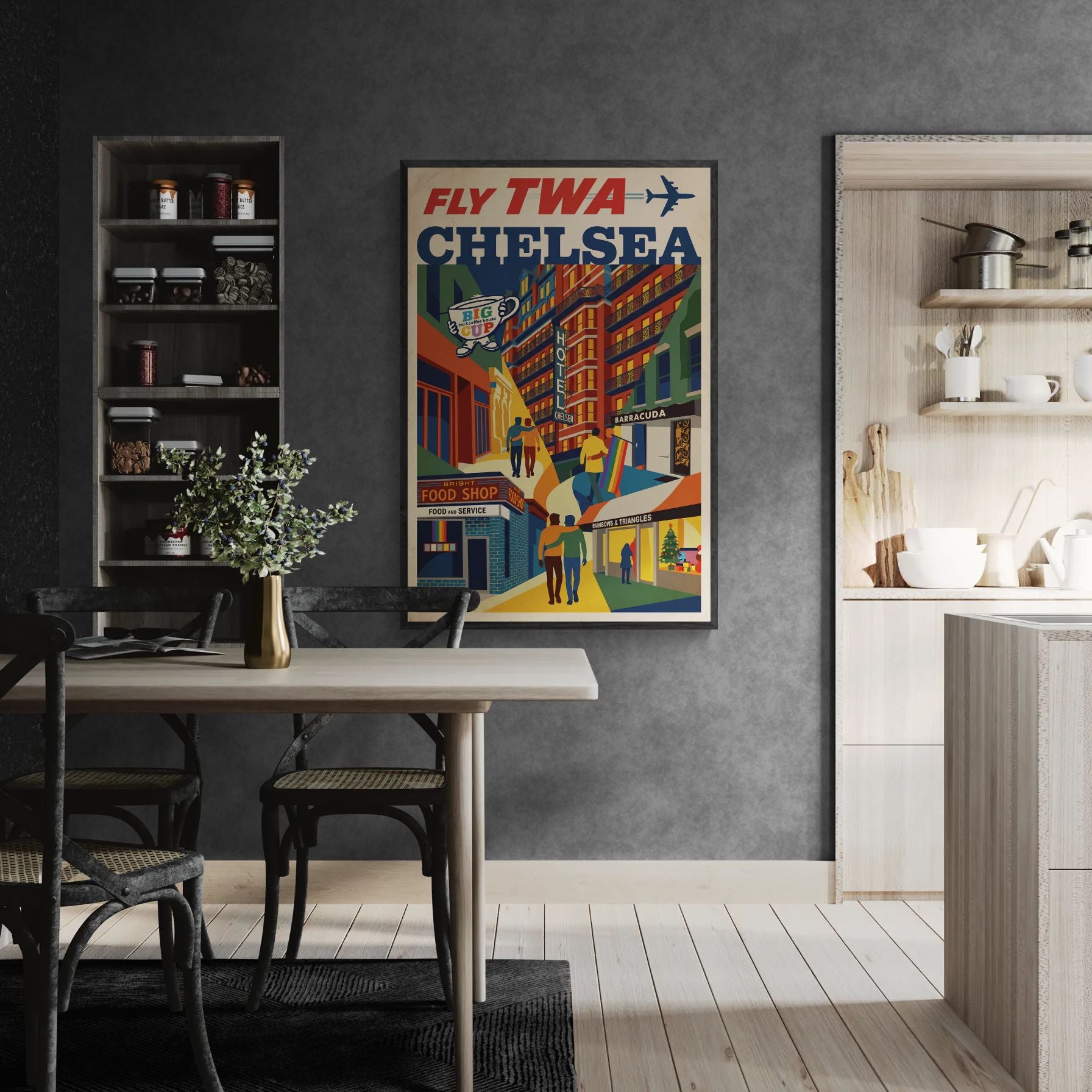 In the bold, celebratory spirit of David Klein’s mid-century airline posters, Fly TWA: Chelsea reimagines Manhattan’s storied neighborhood in the saturated optimism of the jet age. Though its prominence as New York City’s premier queer enclave has since shifted northward to Hell’s Kitchen, Chelsea remains ground zero for generations who came of age in the late twentieth century. Brownstones, galleries, and Hudson light are elevated to civic icons, while couples move through the streets with easy familiarity. This imagined circa-1960 rendering offers a loving tribute—positioning Chelsea not as a passing chapter, but as an enduring landmark in the cultural map of belonging.Product features