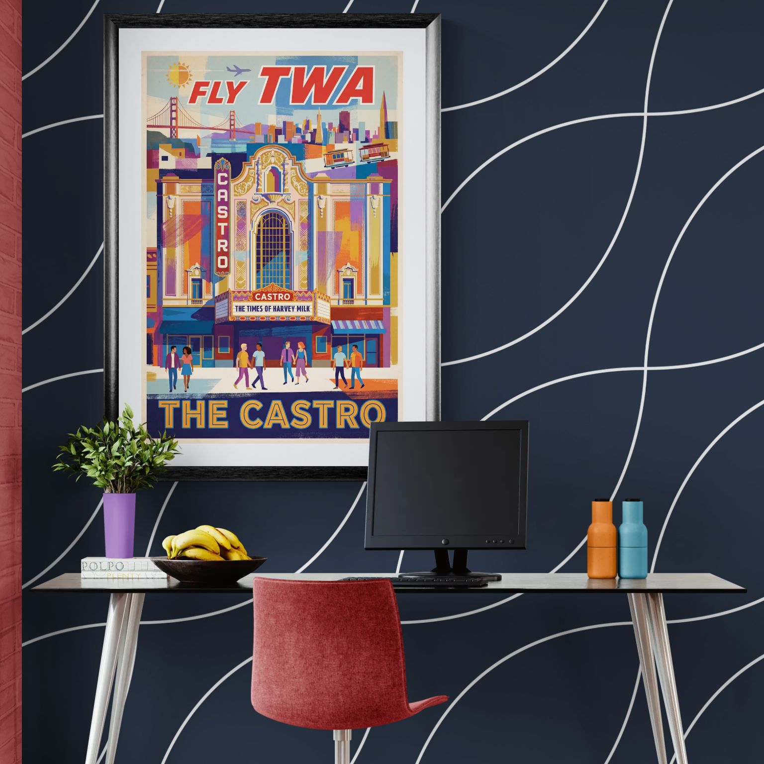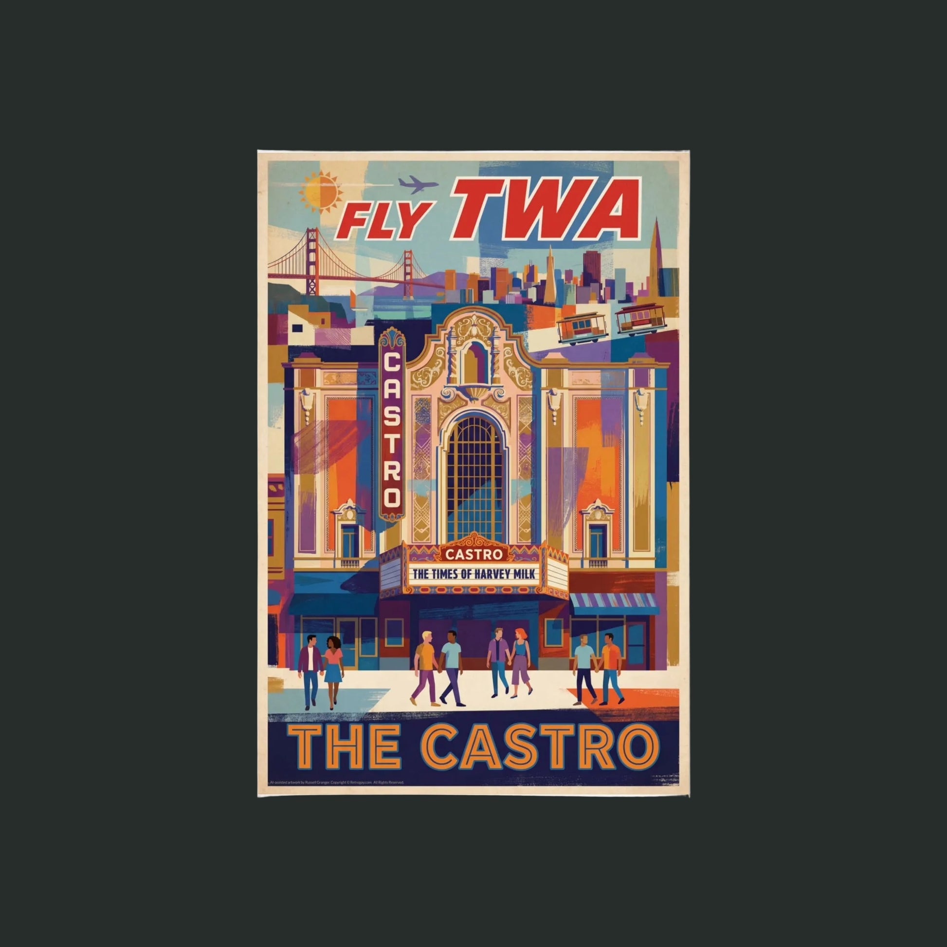 In the bold, celebratory language of mid-century airline advertising, Fly TWA: The Castro reimagines San Francisco’s most storied neighborhood as a featured destination of the jet age. Inspired by the vibrant civic glamour of 1950s and ’60s travel campaigns designed by the great David Klein, the composition elevates architecture, color, and community to iconic status. The Castro Theatre becomes a beacon beneath sweeping skies and modern flight paths, while couples stroll openly in the foreground—unremarkable, unhurried, entirely at ease. What was once a coded enclave is presented here with the confidence of a marquee city attraction. The invitation is clear: come see. Come belong. The future has already landed.