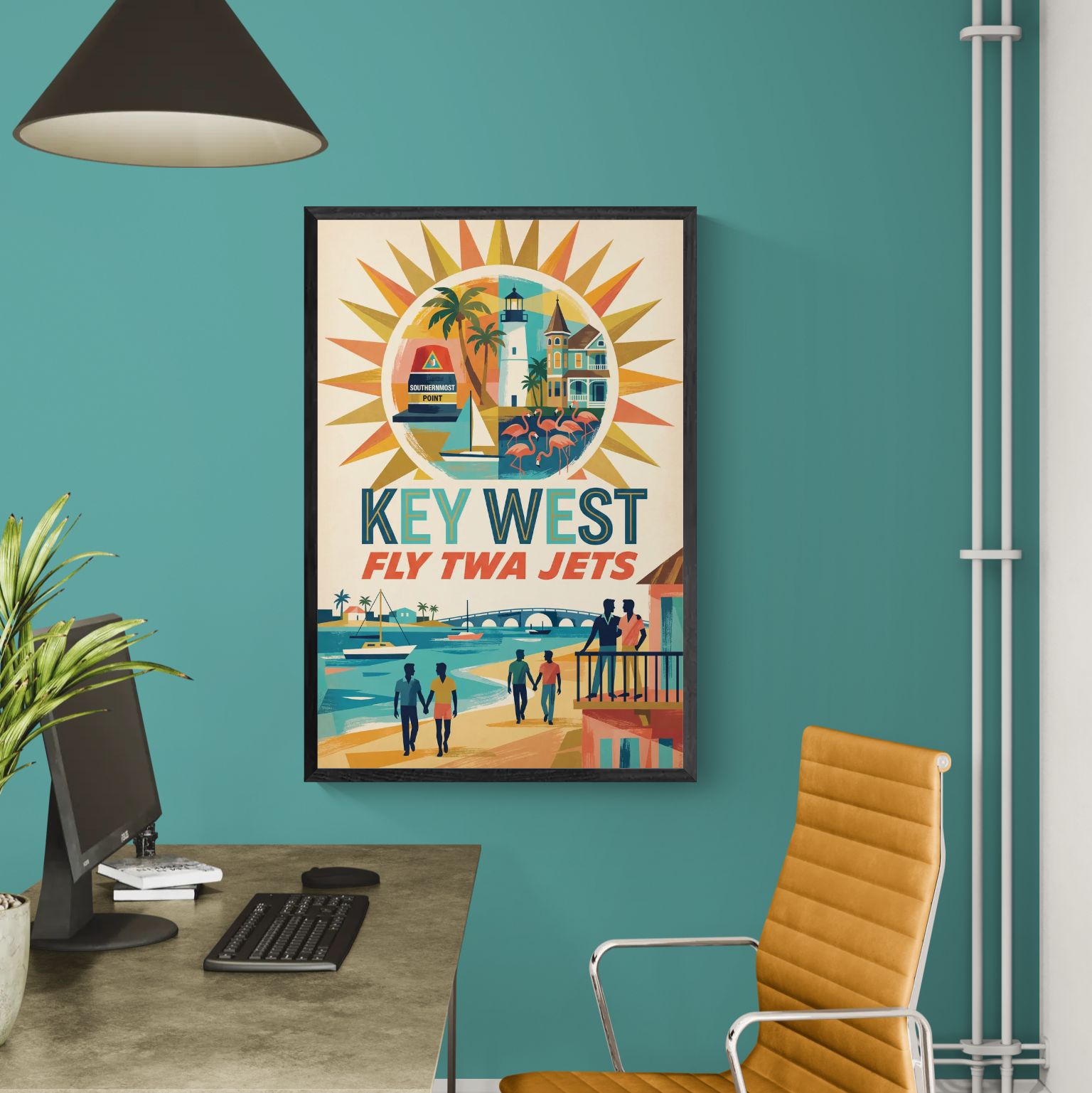 In the sun-drenched optimism of the jet age, Fly TWA Jets: Key West transforms America’s southernmost point into a marquee destination of color, warmth, and welcome. Drawing on the bold graphics and civic pride of mid-century airline campaigns designed by the great David Klein, the composition layers a lighthouse, pastel architecture, and a sweeping causeway beneath a radiant tropical sun. Yet the true center of gravity lies along the shoreline, where couples walk openly, hands joined, unremarkable in their ease. Long associated with artistic independence and queer refuge, Key West emerges here not as a hidden enclave, but as a celebrated arrival point. The message is pure jet-age promise: paradise is closer than you think.